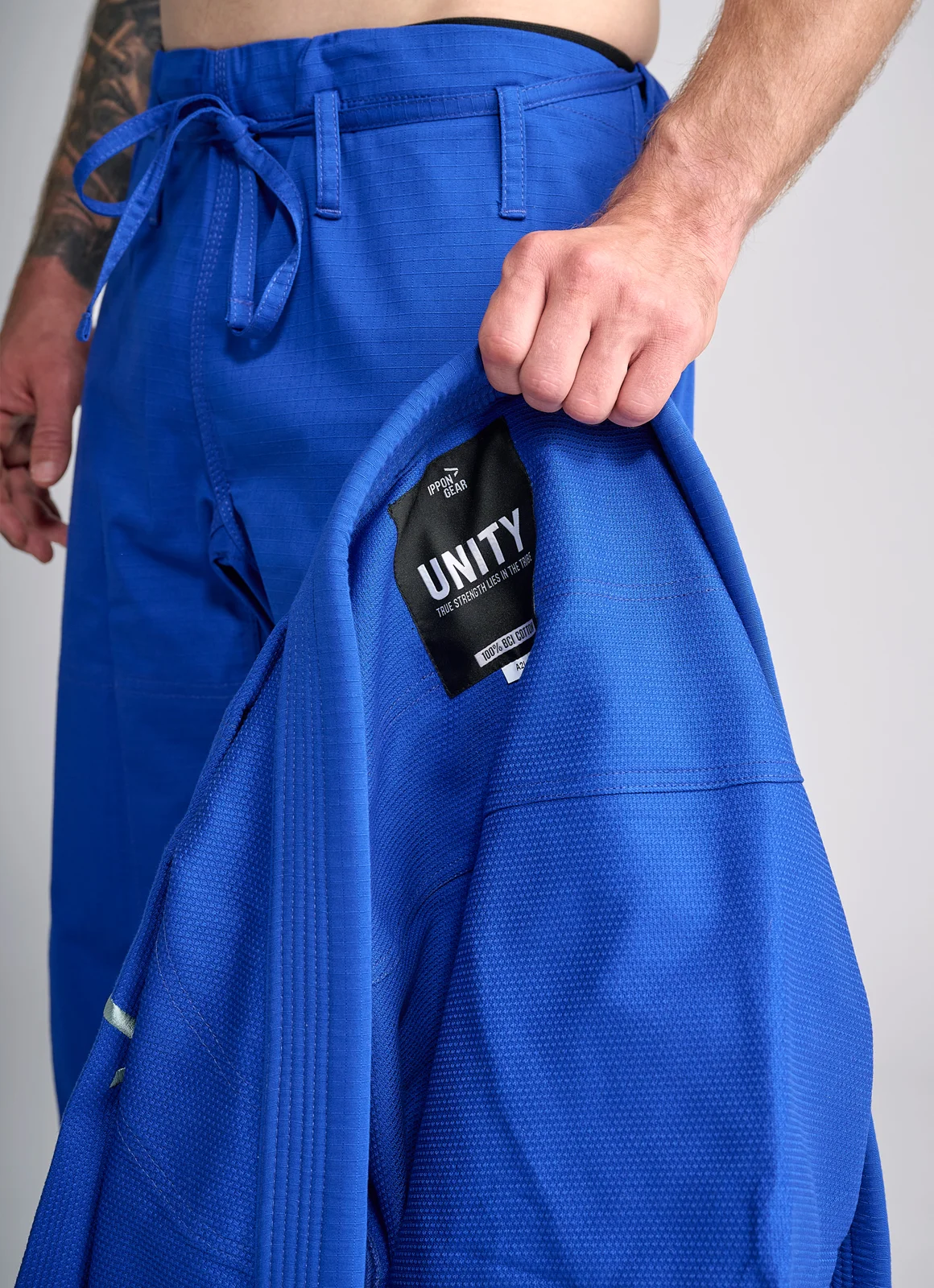 Como en todos los modelos BJJ de IPPONGEAR, el Unity luce el emblemático lema en el cuello, símbolo de unión dentro y fuera del tatami.