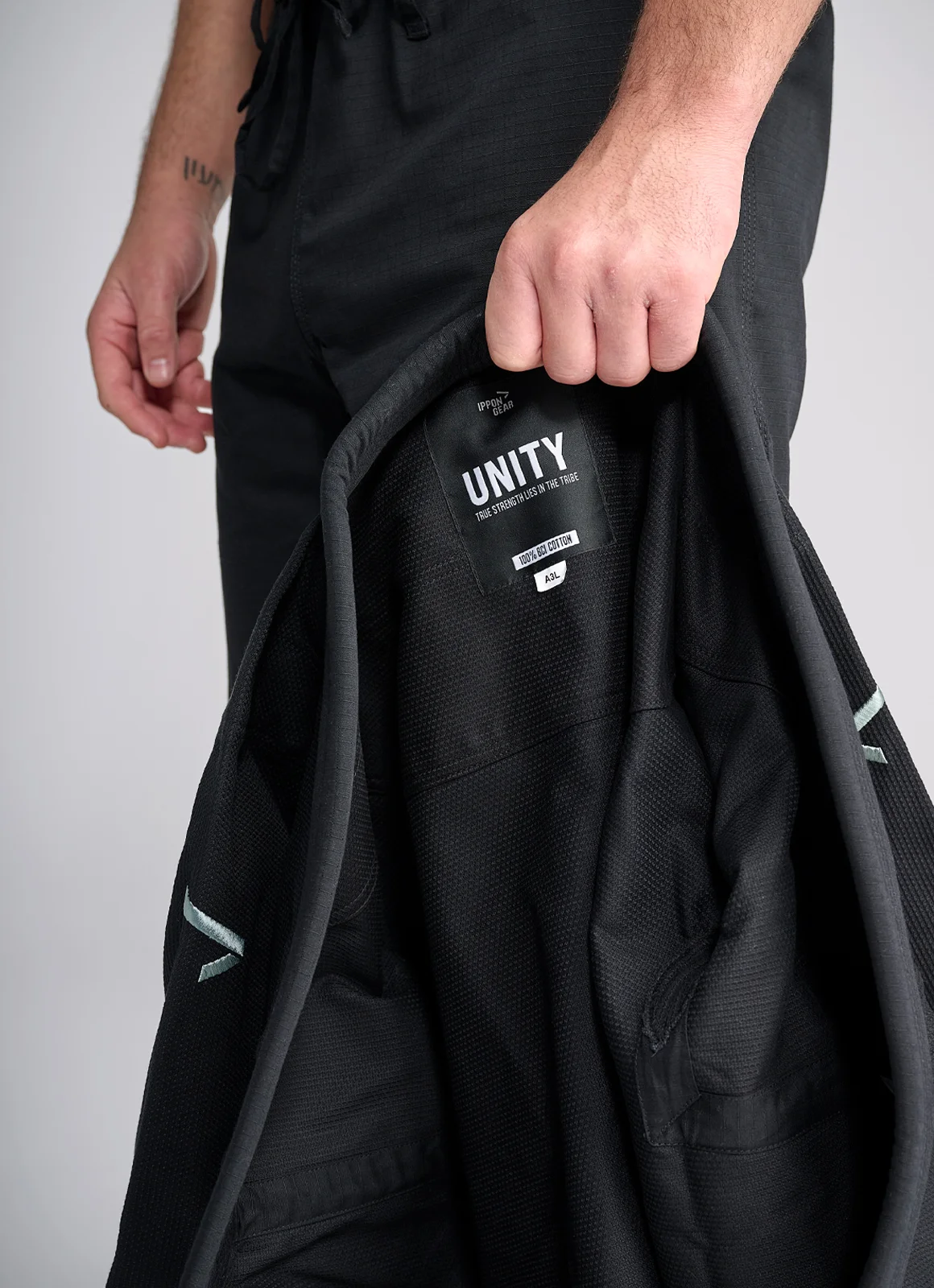 Como en todos los modelos BJJ de IPPONGEAR, el Unity luce el emblemático lema en el cuello, símbolo de unión dentro y fuera del tatami.