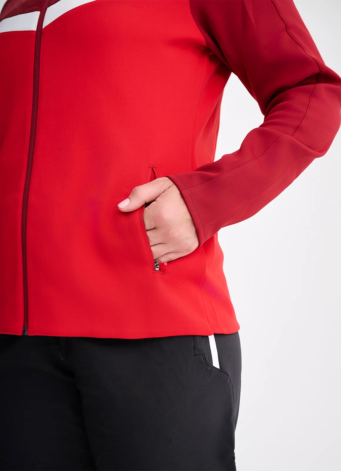 Potencia y estilo en un mismo diseño. Con un ajuste femenino y detalles en contraste, esta chaqueta roja ofrece calidez, ligereza y un look moderno ideal para entrenar o vestir a diario.